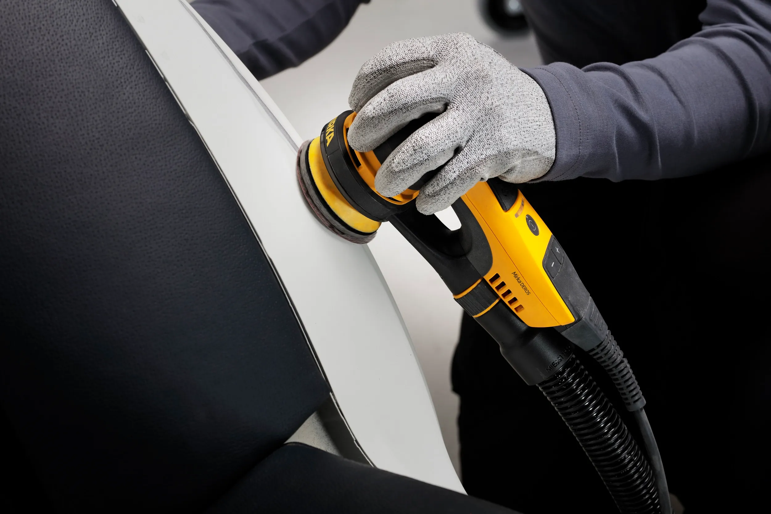 As part of the Mirka dust-free sanding solution, the Mirka DEROS enables efficient dust-free sanding and a Bluetooth connectivity allows seamless integration with the myMirka app for vibration monitoring.